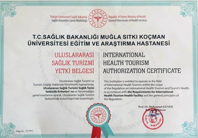 Muğla Eğitim Araştırma Hastanesine Uluslararası sağlık turizmi belgesi