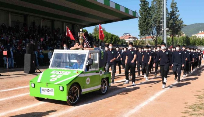 Elektrikli araçlar kategorisinde "Gale 48" isimli araç ile TEKNOFEST 2021'de jüri özel ödülü alan Menteşe Şehit Ziya İlhan Dağdaş Mesleki ve Teknik Anadolu Lisesi öğrencileri tören geçişi sırasında büyük alkış aldı.