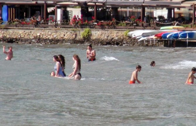 Hafta sonu olması edeniyle günübirlik tatilcilerin en fazla rağbet gösterdiği Akyaka sahili yaz aylarını aratmıyor. Sahilde şezlong ve şemsiyelerin tamamı dolu olurken, günübirlik tatilciler deniz ve güneşin tadını çıkarıyor.