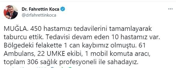 Konu ile ilgili sosyal medya hesabından paylaşım yapan Sağlık Bakanı Dr. Fahrettin Koca, açıklamasında "Muğla'da 450 hastamızın tedavilerini tamamlayarak taburcu ettik. Tedavisi devam eden 10 hastamız var. Bölgedeki felakette 1 can kaybımız olmuştu. 61 ambulans, 22 UMKE ekibi, 1 mobil komuta aracı, toplam 306 sağlık profesyoneli ile sahadayız" ifadelerine yer verdi.