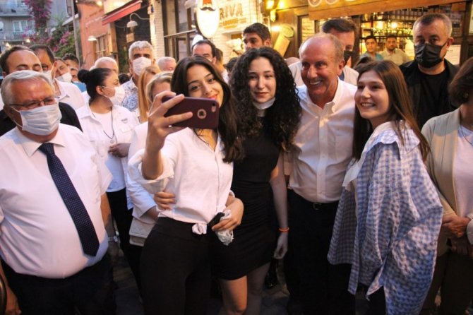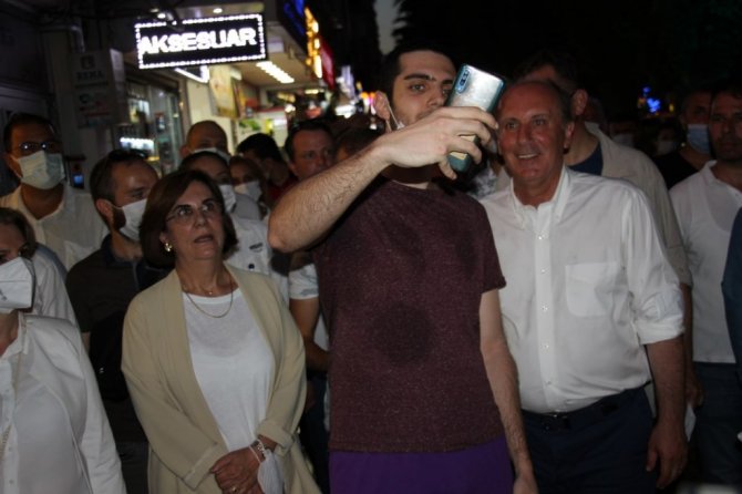 Beraberindeki heyet ile birlikte İl Başkanlığı binasına yürüyen İnce'nin, yol boyunca maske takmaması dikkat çekti. İnce, kendisine ilgi gösteren ve hatıra fotoğrafı çektirmek isteyen vatandaşlar ile tek tek fotoğraf çektirirken, özçekim yapmak için kendisine yaklaşan bir genci sosyal mesafe konusunda uyarırken kendisinin maskesiz olması ise dikkat çekti.