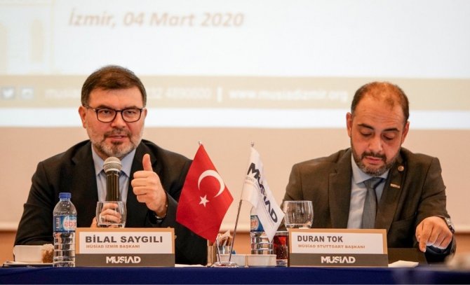 Toplantıda konuşan MÜSİAD İzmir Başkanı Bilal Saygılı, erdem, ahlak ve güven temelinde yükselen bir iş dünyası tasavvuruyla MÜSİAD’ın çalışmalarını sürdürdüğünü ifade ederek büyük ve güçlü Türkiye hayaliyle bu yolculuğuna devam ettiklerini belirtti. MÜSİAD’ın modern ahilik teşkilatı olduğunu vurgulayan Saygılı, manevi değerleri olan ve ülkesinin geleceğini düşünen on iki güzel insanla beraber MÜSİAD’ın kurulduğunu anlatarak şunları ifade etti: "MÜSİAD üyeleri olarak bizler bir davanın bir sevdanın yoluna baş koyduk. Karınca misali de olsa kazandığımız helal kazançlarla helal dairede hem etrafımıza faydalı olmanın hem de bu vatanın sancağını dünyanın dört bir yanında dalgalandırmanın sevdalısı serhat erleriyiz. Bu neferlik anlayışımızı da en güzel idrak eden gurbetteki MÜSİAD teşkilatlarımızdır. Onlar bizim mihenk taşlarımız, kıymetlilerimizdir. Bu anlamda değerli MÜSİAD Stuttgart Başkanımız Duran Tok’u ve ticaret heyetini ağırlamaktan memnuniyet duyduğumuzu ifade etmek isterim. İnşallah bu görüşme ve ziyaretlerle MÜSİAD Stuttgart ticaret heyetimiz ile güzel projelere imza atmış olacağız" dedi.