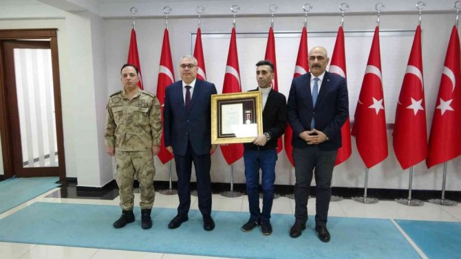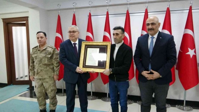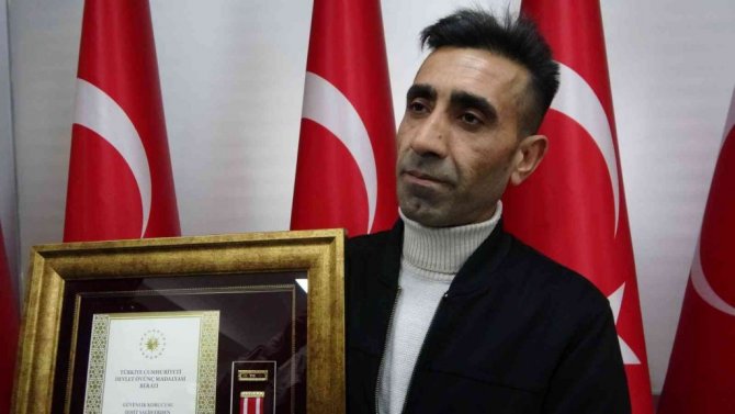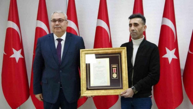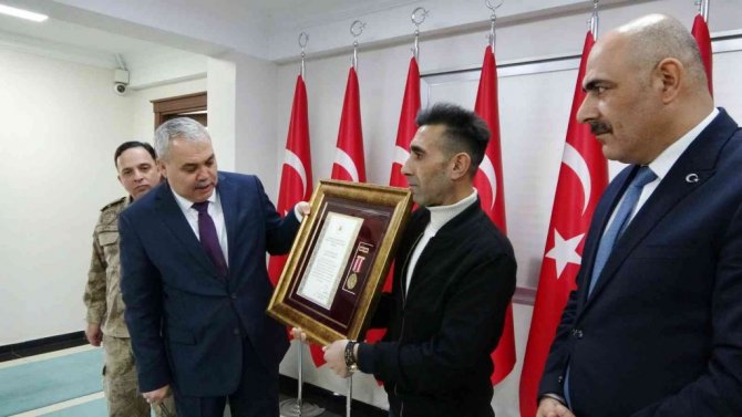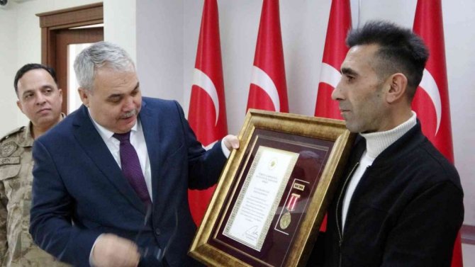 Muş Valisi İlker Gündüzöz, Cumhurbaşkanı Recep Tayyip Erdoğan imzasıyla gönderilen "Devlet Övünç Madalyası Beratı'nı şehidin güvenlik korucusu oğluna tevcih etti.
