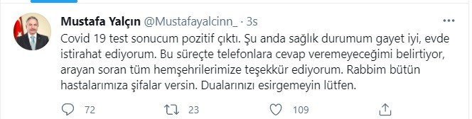 Talas Belediye Başkanı Mustafa Yalçın, sosyal medya hesabından "Covid 19 test sonucum pozitif çıktı. Şu anda sağlık durumum gayet iyi, evde istirahat ediyorum. Bu süreçte telefonlara cevap veremeyeceğimi belirtiyor, arayan soran tüm hemşehrilerimize teşekkür ediyorum. Rabbim bütün hastalarımıza şifalar versin. Dualarınızı esirgemeyin lütfen" notu ile Covid-19'a yakalandığını duyurdu.