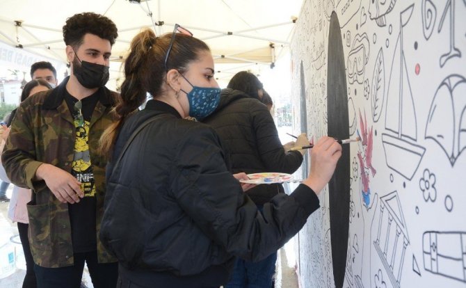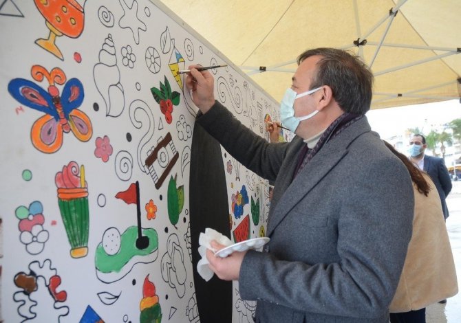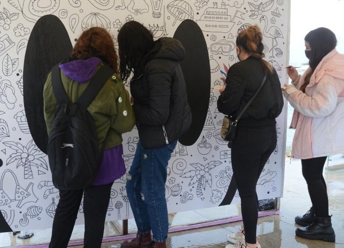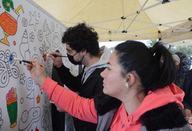 Etkinlikte palet ve fırçaları ellerine alan vatandaşlar Kuşadası Belediyesi tarafından hazırlanan mutluluğun resmini boyadı.