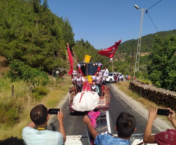 Denizli'nin Buldan ilçesinde dünya evine giren iş makinesi operatörü damat, gelini evden kepçeyle alarak mutluluk turu attı.