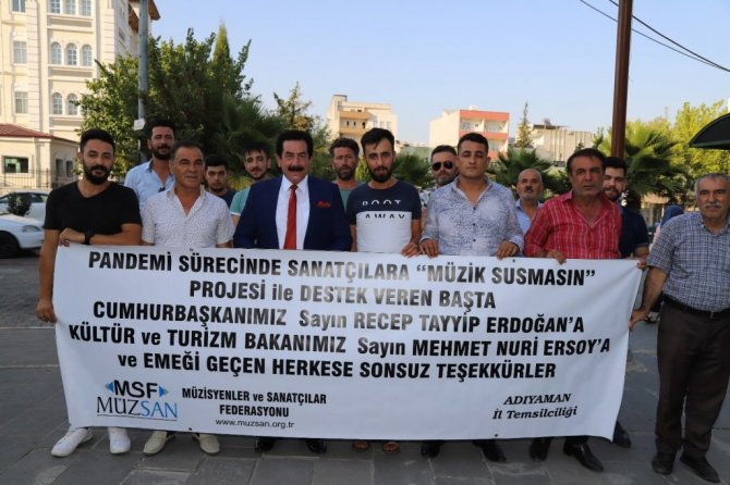 MÜZSAN Adıyaman İl Başkanı Halil Tanyıldız açıklamasında, "Sanata ve sanatçıya korona virüs salgını döneminde maddi ve manevi desteklerini esirgemeyen başta Cumhurbaşkanı Recep Tayyip Erdoğan olmak üzere Kültür ve Turizm Bakanı Mehmet Nuri Ersoy'a teşekkür ediyoruz. Salgın dolayı ülke genelinde kapanma olduğunda müzisyen ve sanatçı arkadaşlarımız çok etkilendi. Ama devletimizin bize yardım elini uzattı. Allah, devletimize zeval vermesin. Bu zor dönemde yanımızda oldu. Biz de sanatçı arkadaşlarımızla beraber emeği geçen herkese teşekkür ediyoruz" ifadelerini kullandı.