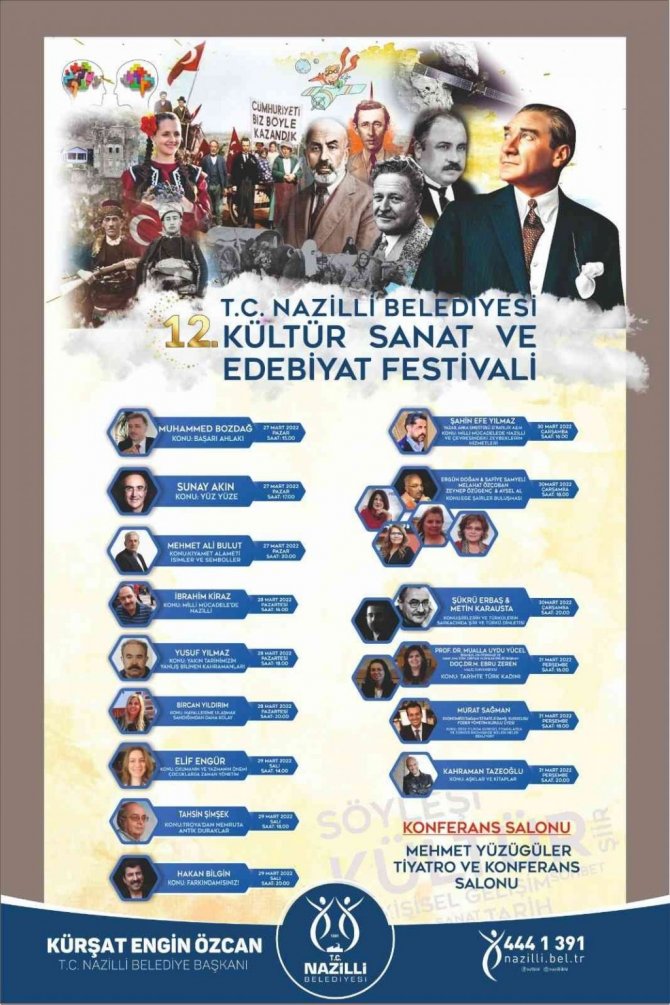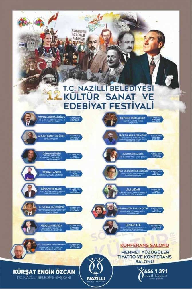 Nazilli Belediyesi tarafından geleneksel hale gelen ve bu yıl 12.'si düzenlenecek olan Kültür, Sanat ve Edebiyat Festivali'nin programı belli oldu. 21-26 Mart tarihleri arasında Mehmet Yüzügüler Tiyatro Salonu'nda gerçekleştirilecek festivalde müzisyenler, gazeteciler, televizyon programcıları, sinema oyuncuları ve yazarlar sanatseverlerle buluşacak.
