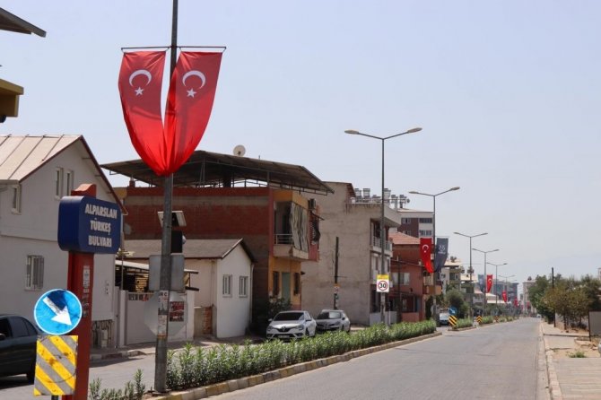 Nazilli Belediyesi ekipleri, Malazgirt Zaferi'nin 950'nci ve Büyük Taarruz'un 99'uncu yıl dönümleri nedeniyle ilçeyi Türk bayrakları ile donattı.