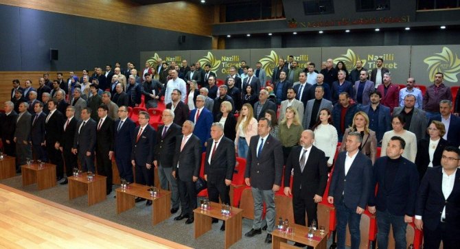 Törende Nazilli’nin ticari hayatı hakkında bilgi veren Nazilli Ticaret Odası Başkanı Nuri Arslan, ekonomiye katkı sağlayan herkese müteşekkir olduklarını belirterek, “Bu ülke için taş üstüne taş koyan herkese teşekkür ediyoruz” dedi.