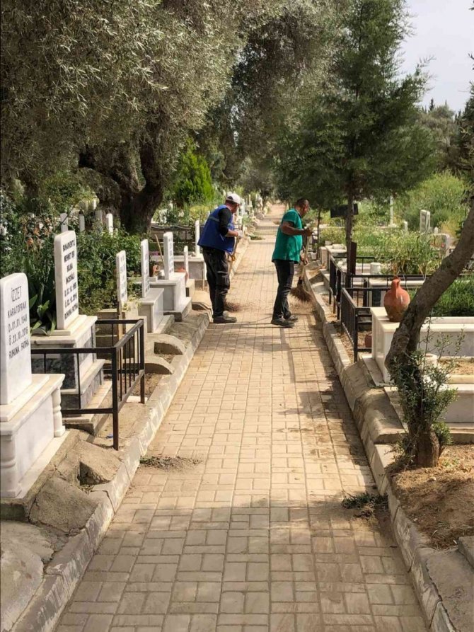 Nazilli Belediyesi Park ve Bahçeler Müdürlüğü'ne bağlı ekipler Ramazan Bayramı öncesi mezarlıklarda ot biçme ve temizlik çalışmalarını tamamladı.
