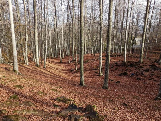 Samsun'un 19 Mayıs ilçesinde bulunan bin 224 rakımlı Nebiyan Dağı, sonbaharda ağaçlarda oluşan renk cümbüşü ile kartpostallık görüntüler oluşturdu. Sonbaharda sarararak yere düşen yapraklar ormanda yüzeyi sapsarı bir örtü gibi kapladı.