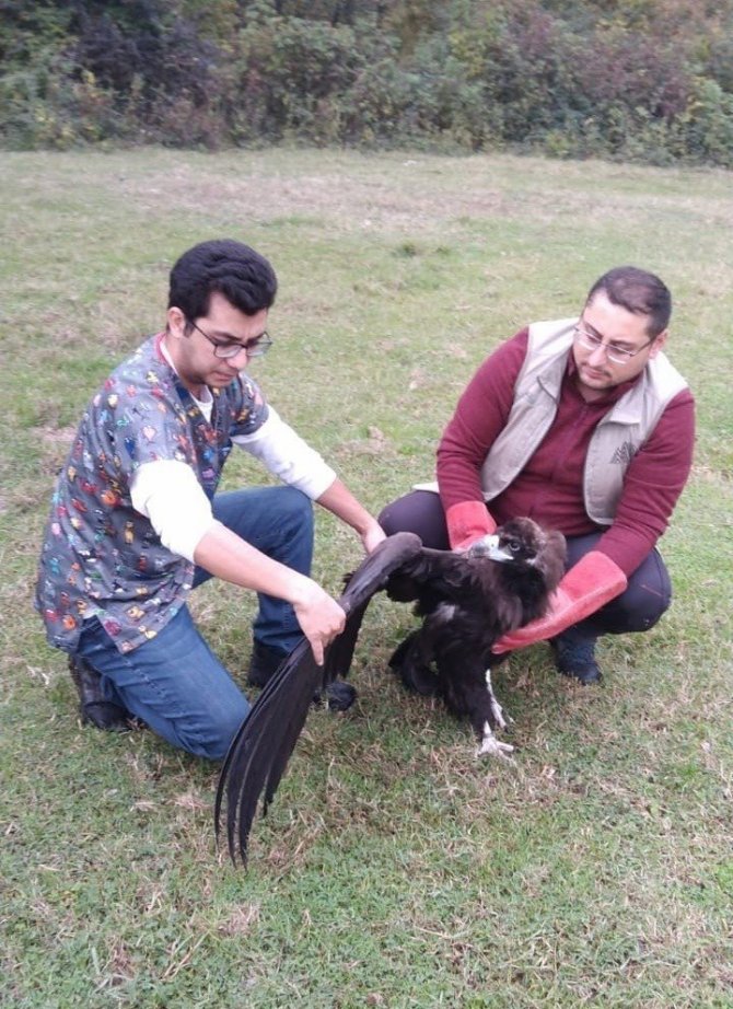 Edinilen bilgiye göre, hayvanlarını otlatan bir vatandaş merada farklı ve büyük bir kuş olduğunu gördü. Durumu Düzce Doğa Koruma ve Milli Parklar Şube Müdürlüğü ekiplerine bildiren vatandaş, ekipler gelinceye kadar da kuşun çevresinde bekledi. Bölgeye gelen doğa koruma ekipleri canlının, nesli tehlike altında bulunan türler arasında yer alan kara akbaba olduğunu belirledi. Akbaba, dinlendirilmek ve detaylı inceleme yapılmak üzere Efteni Gölü Yaban Hayatı Geliştirme Sahası'na götürüldü. Veteriner hekim ve yaban hayat uzmanı personel tarafından incelenen kara akbabaya, Yunanistan'da bulunan Atina Üniversitesince halka ve takip cihazı takıldığı belirlendi. Kara akbabanın uçabilecek duruma gelmesinin ardından yeniden doğaya bırakılacağı öğrenildi.
