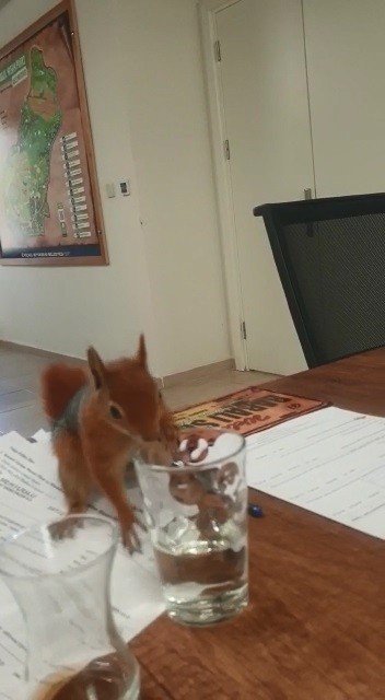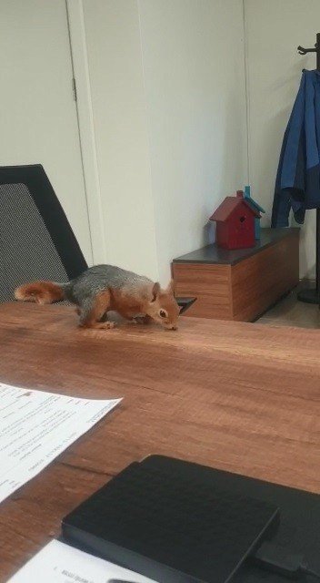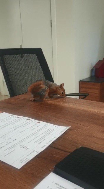 Her sabah erken saatte Ormanya personellerinin geliş saatlerinde yönetim ofisine giren kızıl sincaplar, ofiste gezinerek çalışma masalarının üzerindeki yiyecek ve içeceklerden tüketmeye başladı. Zamanla personelin bardaklarından su içmeye de başlayan kızıl sincaplar, ofisteki çalışanların adeta neşe kaynağı haline geldi.