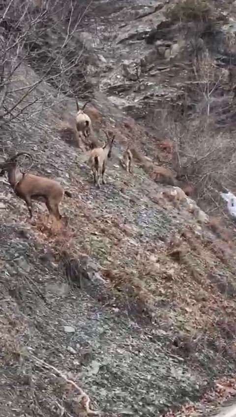 Nesli tükenme tehlikesi altında bulunan dağ keçileri yola indi, vatandaşlar cep telefonlarına sarıldı