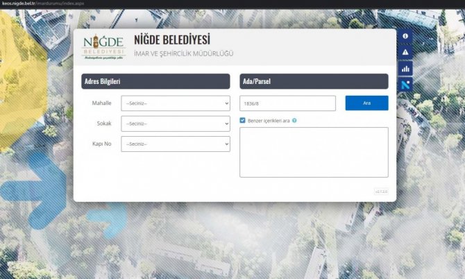 Aylık ortalama 4 bin 500 kişinin imar durumu sorgulaması yaptığı uygulamada, son güncellemeler ile parsele ilişkin uydu fotoğrafı, adres ve konum bilgisi, imar uygulaması veya plan değişikliği yapılıp yapılmadığına dair bilgilere erişiliyor. Ayrıca Plan Askı Panosu uygulaması ile imar planında yapılan değişikliklere ilişkin bilgilere de vatandaşlar Niğde Belediyesi internet sitesinden ulaşabiliyor.