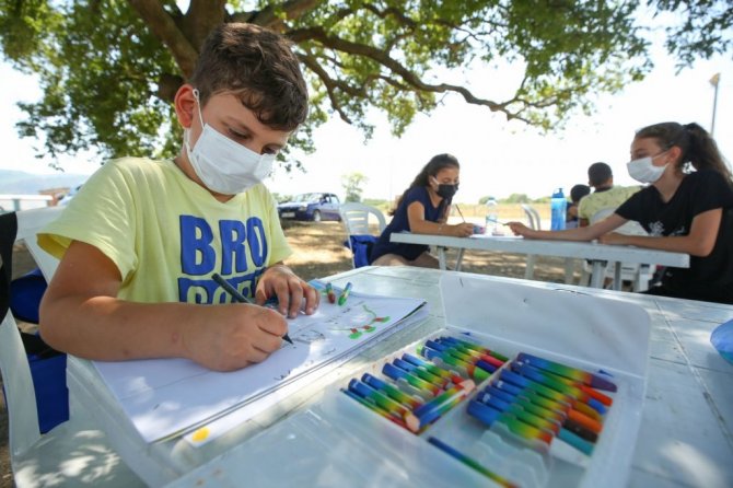 Nilüfer Belediyesi'nin kırsal mahallelerde gerçekleştirdiği "Nilüfer'in Çocukları Sanatla Büyüyor" projesine katılan çocuklar, resim atölyesinde kendini...