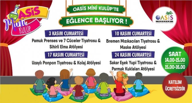 Geçmişten günümüze düzenlediği çeşitli etkinliklerle çocukların ve ailelerin öncelikli tercihi olan Oasis Alışveriş Kültür ve Eğlence Merkezi, kasım ayında çocuklar için doyasıya eğlenecekleri yepyeni bir etkinlik programı sunuyor. Kasım ayı boyunca her cumartesi, 14.00 – 16.00 saatleri arasında Oasis Mini Kulüp’te, eğitici ve öğretici çocuk masallarının tiyatroları sahnelenecek. Tiyatroyu izleyen tüm çocuklar tiyatro bitiminde, tiyatronun atölyesine katılma fırsatını yakalayarak, hafta sonunda doyasıya eğlenecek.