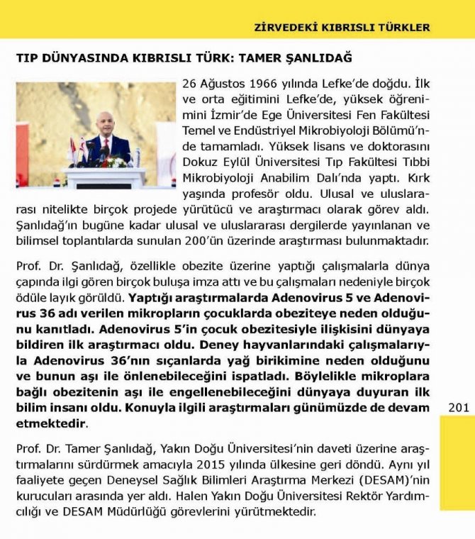 Obezite üzerine yaptığı çalışmalarla büyük ilgi gören ve birçok buluşa imza atarak ödüller kazanan Prof. Dr. Tamer Şanlıdağ, mikroplara bağlı gelişen obezitenin aşı ile önlenebileceğini dünyaya duyuran ilk Kıbrıslı Türk bilim insanı unvanı ile ortaokullarda öğretmen kılavuzu olarak kullanılacak olan Teknoloji ve Tasarım 8 kitabında farklı dallarda isimlerin bulunduğu Tıp Alanında “Zirvedeki Kıbrıslı Türkler” bölümünde yer aldı.