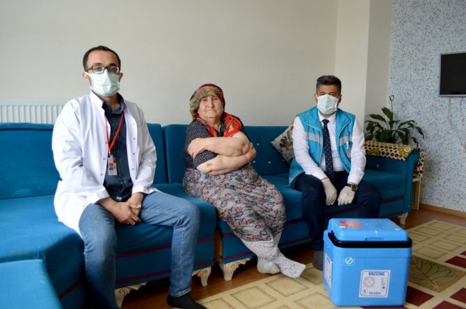 Kayseri'nin İncesu ilçesinde yaşayan 91 yaşındaki Raziye Erdoğan'a koronavirüs aşısının ilk dozu, İncesu Devlet Hastanesi Evde Aşı Biriminde görevli Dr. Çağrı Apaydın ve Sağlık Memuru Kürşat Taş tarafından evinde uygulandı.