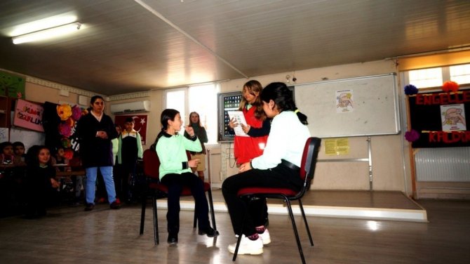 Sarıgöl Atatürk Ortaokulu rehberlik öğretmeni Aygül Özsoy, özel eğitim sınıfı öğretmeni Hafize Temirkaya ve öğrencileri engellilerin yaşamlarında hangi engellerle karşılaştıklarını mizansen olarak okuldaki arkadaşlarını ve davetlilere sundu.