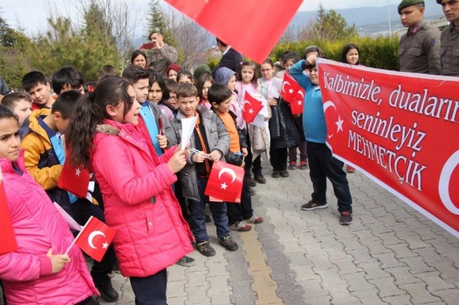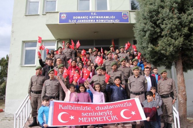 Ellerinde Türk bayrakları ve "Kalbimizle, dualarımızla, seninleyiz Mehmetçik" yazılı dövizleri ile İlçe Jandarma Komutanlığını ziyaret eden minik öğrenciler askerler tarafından kapıda karşılandı.