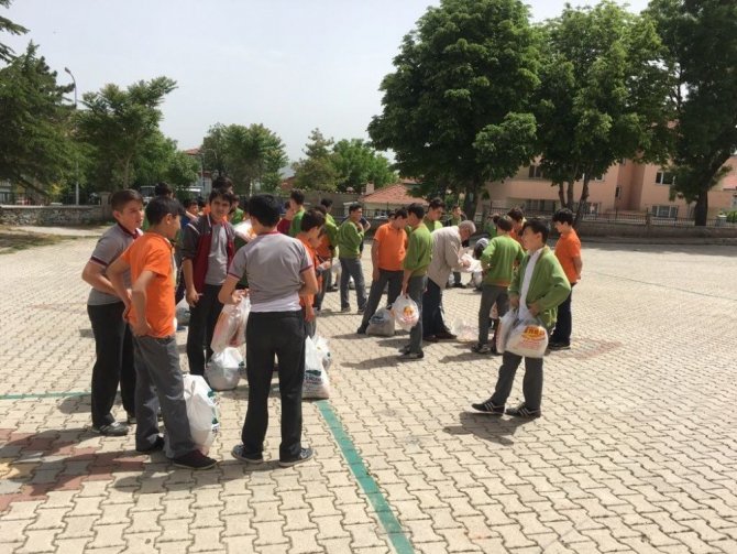 Kütahya’nın Domaniç Ortaokulu öğrencileri, ihtiyaç sahiplerine Ramazan erzağı dağıttı.