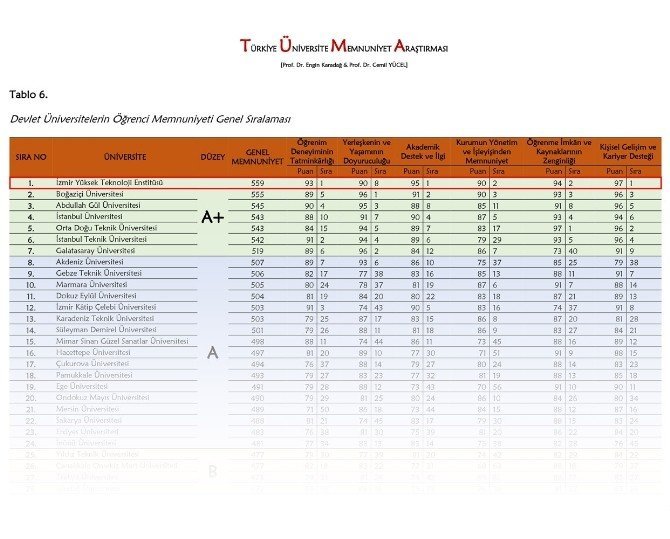 Üniversitelerin; öğrenim deneyiminin tatminkarlığı, yerleşkenin ve yaşamın doyuruculuğu, akademik destek ve ilgi, kurumun yönetim ve işleyişinden memnuniyet, öğrenme imkan ve kaynaklarının zenginliği, kişisel gelişim ve kariyer desteği gibi kriterlere göre sıralandığı araştırma, Eskişehir Osmangazi Üniversitesi’nin öğretim üyeleri Prof. Dr. Engin Karadağ ve Prof. Dr. Cemil Yücel tarafından yapıldı. Çalışmadan elde edilen veriler ışığında sıralanan üniversitelere ‘A+’, ‘A’, ‘B’, ‘C’, ‘D’ ve ‘FF’ gibi notlar verildi. A+ alan 8 devlet üniversitesi arasında birinci sırada yer alan İYTE’yi, Boğaziçi Üniversitesi ve Abdullah Gül Üniversitesi izledi. A+ alan toplam 19 üniversiteden 12’si ise vakıf üniversiteleri oldu.