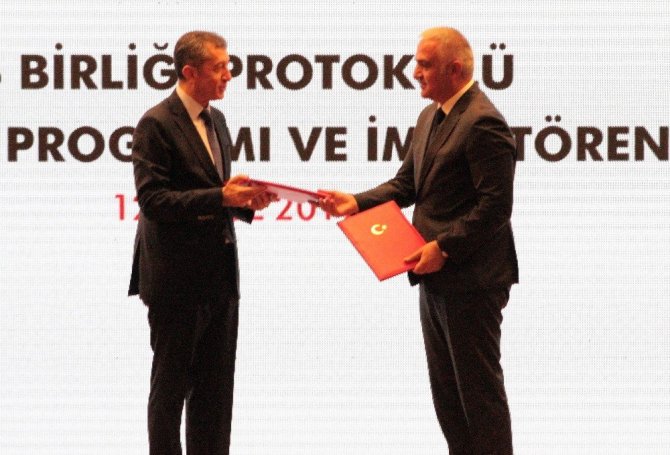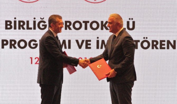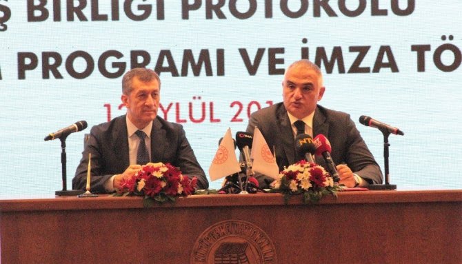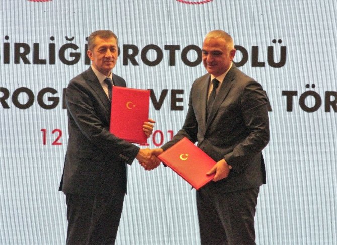 Kültür ve Turizm Bakanı Mehmet Nuri Ersoy, “Milli Eğitim Bakanlığımızla yaptığımız protokol çok önemli. Göreve geldiğimizden beri gerek Milli Eğitim Bakanlığımızla gerekse diğer bakanlıklarla çok iyi bir etkileşim içerisindeyiz. Önemli olan yeni ve çağdaş eğitim sistemleriyle öğretmenlerimizin daha iyi yetişmesi için Milli Eğitim Bakanlığı’nın uygun gördüğü projelere destek vermeye devam edeceğiz. Daha önce Sinema Genel Müdürlüğümüzün başlattığı, ‘Sinema Seyretmeyen Çocuk Kalmasın’ projesiyle 2 milyon çocuğumuzu sinemayla buluşturduk. Bu sene de bu projeye devam edeceğiz. Biz de sinemacılarla birlikte çocuklarımızın bu projelerden faydalanmasını sağlıyoruz. Turist sayımızı arttırmak istiyoruz. Nitelikli turisti ülkemize kazandırmak istiyoruz. Bunun için en önemli etkende insan kaynakları. İnsan kaynakları konusunda da en etkili çalışacağımız yer yine Milli Eğitim Bakanlığı. Geçen sene Milli Eğitim Bakanlığı’yla yaptığımız bir protokol sonucu Turizm Meslek Liseleri’nin müfredatında ciddi bir değişime gidildi. Sektörün ihtiyacı insan ağırlıklı bir eğitimin verilmesiydi, uygulamalı eğitimin verilmesiydi. Bu kapsamda imzalanan protokolle birlikte yaz stajları başarıyla uygulandı. Yakın bir tarihte yine bir protokolle bu öğrencilerinin 2023’e kadar olan gelişimleriyle ilgili planlamayı sonuçlandıracağız. Bu protokol hem turizmciler hem öğrenciler tarafından olumlu karşılandı. Eğitimler boyunca 3 lisan öğretiyoruz. İngilizce ve Rusça mecburi lisan bir tane de seçmeli lisan öğreniyorsunuz. Mezun olduklarında turizmcilik yapmasalar bile hayat kariyerlerinde çok önemli 3 lisan öğrenmiş oluyorlar. İnanıyorum bütün sektörlere örnek olacak bir uygulama” dedi.