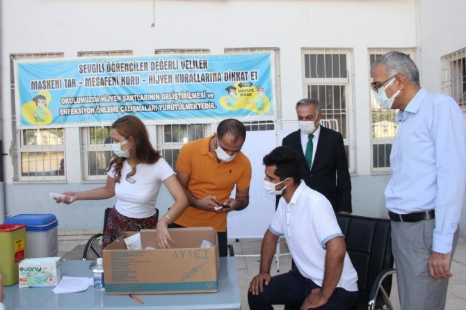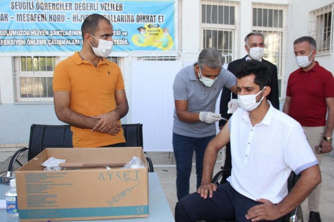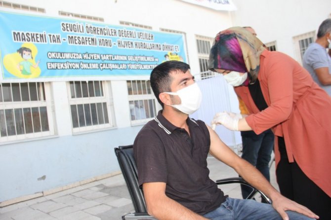 Adıyaman'da, aşı olmayan öğretmen ve veliler okul bahçesine kurulan aşı standında ikna edilerek aşı yapıldı.