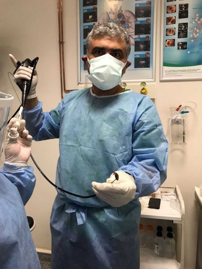 Göğüs Hastalıkları Bölümü Uzmanı Doç. Dr. Murat Acat'ın başarılı operasyonu ile sağlığına kavuşan hastanın aylar önce kabak çekirdeği yediği öğrenildi. Doç. Dr. Acat, "Hastamız bana öksürük şikayeti ile geldi. Akciğer tomografisinde sağ alt lob bronşu komşuluğunda lezyon görünüyordu. Bronkoskopi yaptım ve yabancı bir cisim gördüm. Sonra biyopsi pensi ile çıkardım. Çıkarınca kabak çekirdeği olduğunu gördük ve çok şaşırdık" dedi.
