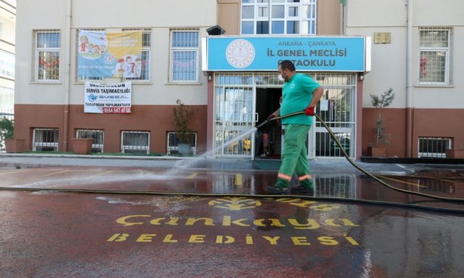 Yeni eğitim öğretim dönemine başlayacak okulların tadilatından sıvı sabun ve dezenfekte dağıtımına kadar ihtiyaçlarını karşılayan Ankara Çankaya Belediyesi, okul bahçelerini de yıkayarak yeni döneme hazırlıyor.