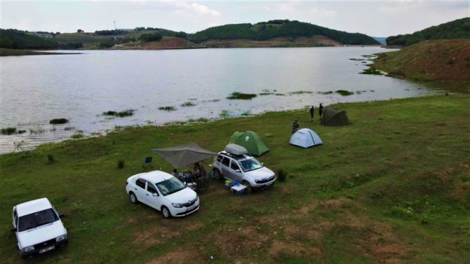 Kocaeli'nin Gebze ilçesinde oltasını ve çadırını yanlarına alan vatandaşlar, kısıtlamasız ilk pazar gününü balık tutup, kamp yaparak değerlendirdi.
