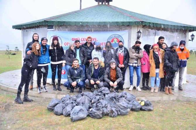 Ondokuz Mayıs Üniversitesi (OMÜ) İletişim Fakültesi öğrencileri Samsun'un Terme ilçe sahilinde eksi 2 derece soğukta ve kar yağışı altında çevre temizliği etkinliği gerçekleştirdi.