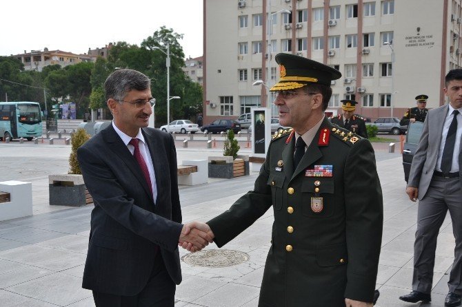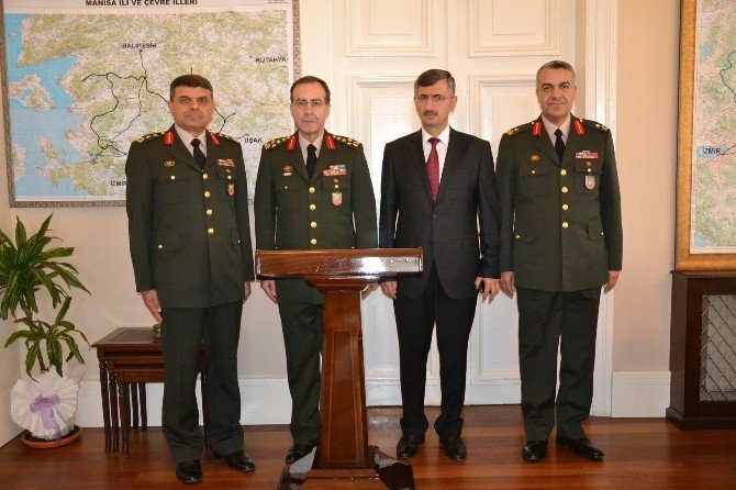 Askeri birlikleri denetlemek ve 1995/2 Tertip ile 359’uncu kısa dönem erlerin yemin törenine katılmak için Manisa’ya gelen Kara Kuvvetleri Eğitim ve Doktrin (EDOK) Komutanı Orgeneral Kamil Başoğlu, Manisa Valisi Erdoğan Bektaş’ı makamında ziyaret etti.
