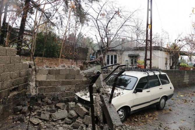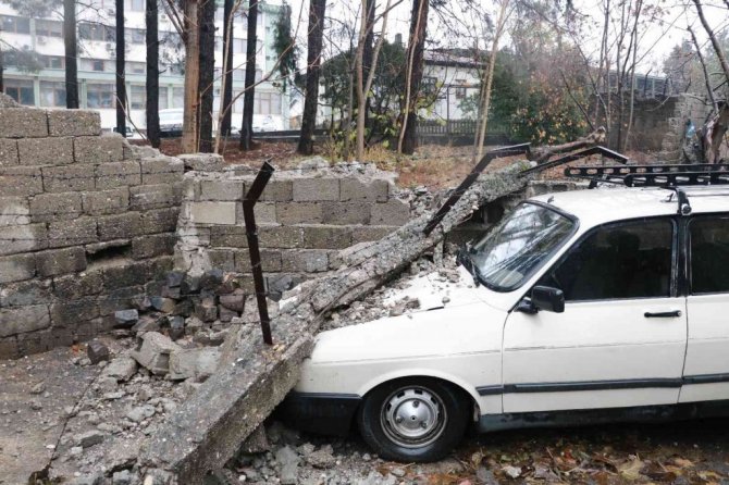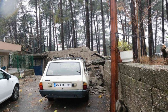 Duvarın devrilmesi sonucu park halindeki otomobil ile duvarın yanında bulunan müstakil evin bahçesindeki bazı eşyalar zarar gördü.
