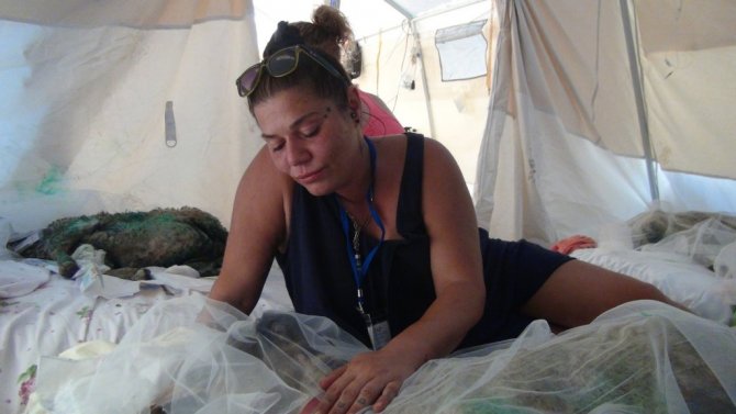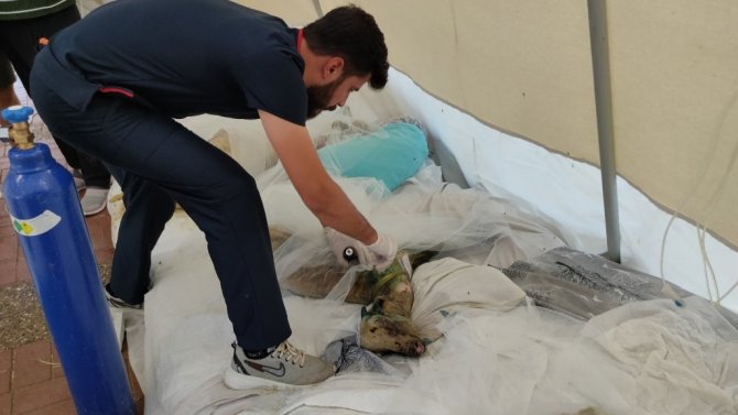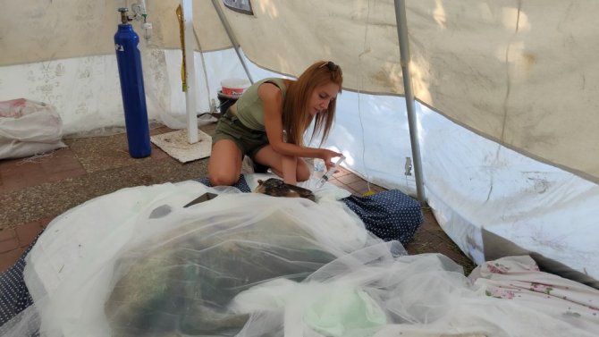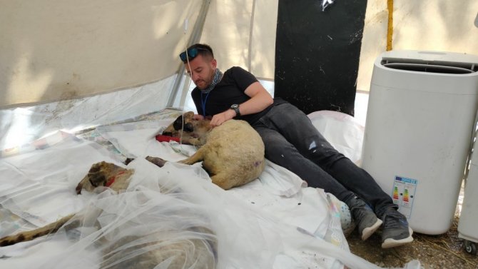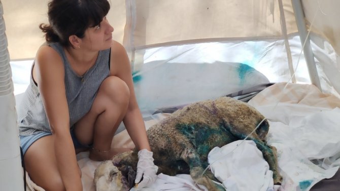 Sahra çadırlarında alevlerin arasından kurtarılan hayvanların tedavi sürecinden bahseden Merve Gülistan Aydın ise gönüllülerin, müzik dinleterek yaralı hayvanları sakinleştirdiğini ifade etti. Merve Gülistan Aydın, "Çok ağır yanıkları olduğu için bu hayvanları çok kıpırdatamadık. Bulundukları yerlerde onlara samandan yataklar yaptık. Çünkü onlar idrarlarını yapıyorlar ve altına koyacağınız naylon onları yakabilir. Her şeyi düşünerek samandan yataklar yaptık. Altlarına bez koyduk. Bu alt bezlerini gün içerisinde defalarca değiştiriyoruz. Serum tedavilerine başladık. Kan cihazları, ultrason cihazları ile tedavilerini hızlandırdık. Bütün hayvanlara yakalık taktık. Hepsinin tedavi protokolü farklı çünkü. Hem antibiyotik hem ağrı kesici kremlerini sürdük. Onun dışında psikolojik olarak destek vermek için bütün gönüllüler yanlarına uzandı, müzik açarak onların daha sakin olmaları için çabaladılar. Sürekli oksijen veriyoruz hayvanlara çünkü dumandan da etkilenen çok hayvanımız vardı. Hepsinin tedavisi tamamlanınca da Bursa'daki çiftliğimize götüreceğiz" diye konuştu.