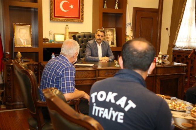 Antalya'da çıkan orman yangınlarında zorlu şartlar altında cansiperane görev yapan Tokat Belediyesi itfaiye erleri nöbet değişimi yaptı. Tokat Belediye Başkanı Eyüp Eroğlu, kente dönen ekibi makamında kabul etti. Başkan Eroğlu, yangınların son bulacağı ana kadar Tokat İtfaiyesi'nin bölgede görevine devam edeceğini belirtti. Başkan Eroğlu, bölgede altı gün boyunca gece-gündüz demeden başarıyla görev yaparak nöbet değişimi yapan itfaiye erlerine teşekkür ederek, "Antalya Gündoğmuş İlçesi'ndeki yangına yardımda bulunmak amacıyla, itfaiye aracımızı ve personellerimizi dualarla göndermiştik. 6 gün boyunca bölgedeki yangınlara müdahale ederek, oradaki insanlara yardımcı olan tüm personellerimize teşekkür ediyorum. Bizle; Yardımedenler Diyarı'nın evlatlarıyız. Tüm itfaiye erlerimize teşekkür ediyor, alınlarından öpüyorum Bölgede hiç uyku uyumadan bölgede gayret eden tüm personelimizden rabbim razı olsun. Hakkınızı ödeyemeyiz. Hamdolsun sağlık ve sıhhatli bir şekilde ailelerinize döndünüz. Şuanda diğer ekibimiz gittiler, bayrak onlara emanet. Onlar da oradaki halkımızın yanlarında olmaya, yangınları söndürmeye devam edecekler. Yangınlar sona erene kadar Tokat Belediyesi itfaiye ekipleri bölgede çalışmalarına aralıksız olarak devam edecekler" dedi.