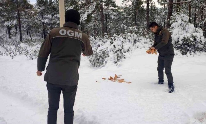 Muğla bölgesinde etkili olan kar yağışı sonrası özellikle yaban hayatının bulunduğu bölgelerde yaşayan canlılar için doğal ortama yem bırakma çalışmalarına Muğla Orman Bölge Müdürlüğü ekipleri de katkı sunuyor.