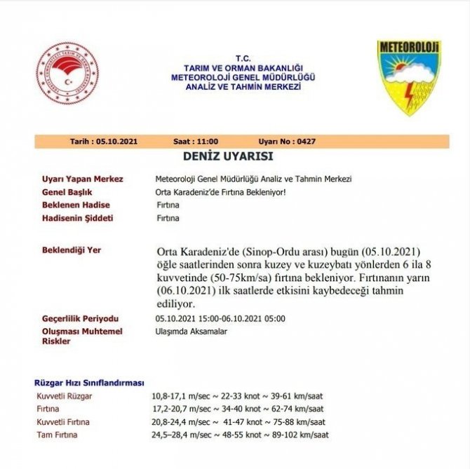 Meteoroloji Genel Müdürlüğü Analiz ve Tahmin Merkezi tarafından yapılan açıklamada, "Orta Karadeniz'de (Sinop-Ordu arası) bugün (05 Ekim 2021) öğle saatlerinden sonra kuzey ve kuzeybatı yönlerden 6 ila 8 kuvvetinde (50-75km/sa) fırtına bekleniyor. Fırtınanın yarın (06 Ekim 2021) ilk saatlerde etkisini kaybedeceği tahmin ediliyor" denildi.