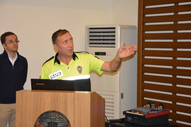 Polis Memuru Ali Çaydaş ve Kıdemli Başçavuş Cafer Gökgöz tarafından verilen eğitimde, "Okul Servis Araçları Hizmet Yönetmeliği" kapsamında sürücülere bilgiler aktarıldı.
