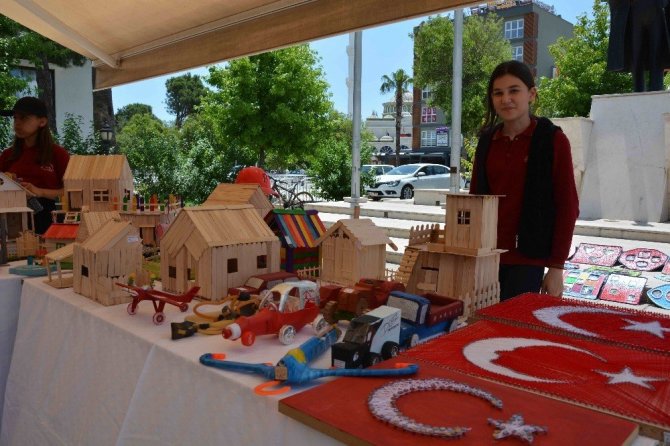 Atatürk Anıtı önündeki sergide, öğrencilerin teknoloji ve tasarım öğretmeni Hatice Bakan eşliğinde yıl boyunca yaptığı çalışmalar “Teknoloji ürün değil, bilimdir” sloganıyla ziyaretçilerin beğenisine sunuldu.