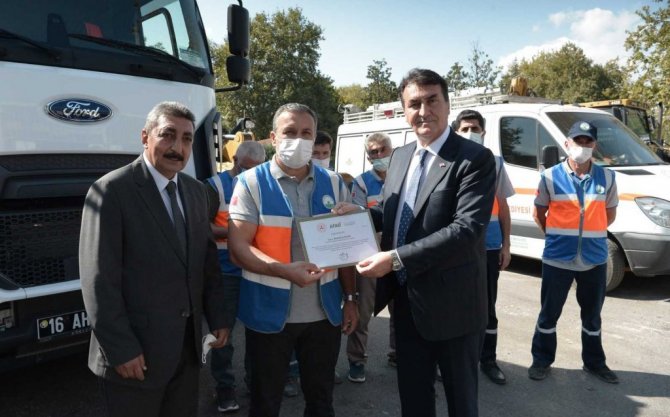 Osmangazi Belediye Başkanı Mustafa Dündar, İçişleri Bakanı Süleyman Soylu tarafından imzalanarak gönderilen teşekkür belgelerini,AFAD Bursa İl Müdürü Yalçın Mumcu ile birlikte personele verdi.