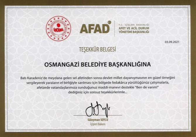 İçişleri Bakanı Süleyman Soylu, Batı Karadeniz'de meydana gelen sel felâketinde yaraların el birliği ile sarılması için bölgede yürütülen çalışmalardan dolayı Osmangazi Belediyesi ve kurtarma ekiplerine teşekkür belgesi gönderdi. Belediye personeline belgelerini Osmangazi Belediye Başkanı Mustafa Dündar verdi.