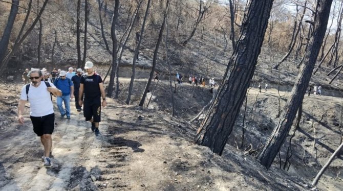 Osmaniye Dağcılık ve Doğa Sporları İhtisas Spor Kulübü Derneği öncülüğünde düzenlenen doğa yürüyüşüne katılan doğaseverler "Elinle yaktığın ateşi gözyaşınla söndüremezsin" sloganıyla yanmış çam ağaçları arasında doğa yürüyüşü gerçekleştirdi.
