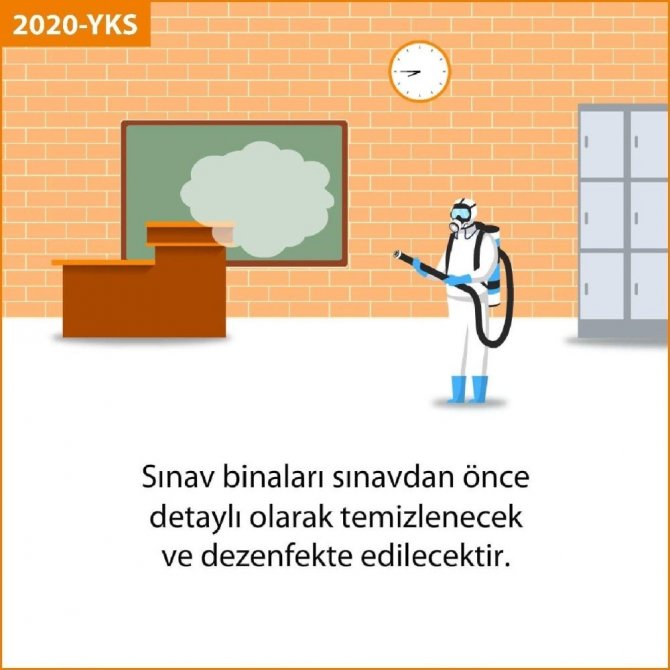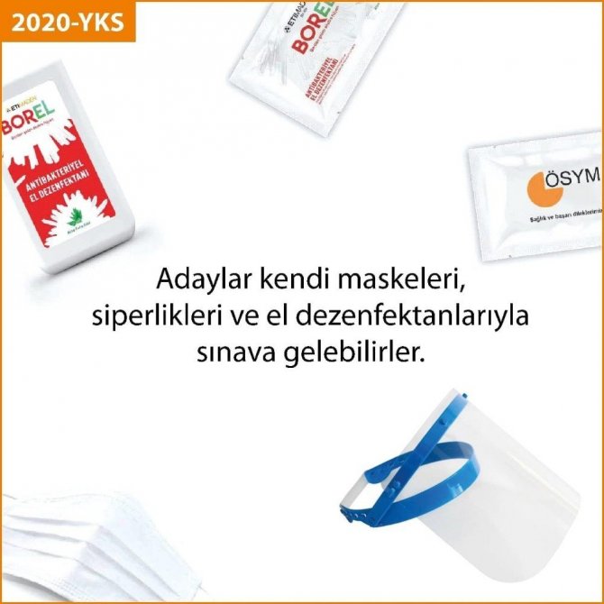 “Sınav binasına girişte, bina içerisinde ve sınav binasından çıkışta adayların sosyal mesafeyi korumaları için görevliler tarafından yönlendirme yapılacak. Bina girişinde adayların ellerine dezenfektan uygulanacak. Bina girişinde adaylara maske dağıtılacak. Bina girişinde adaylara el dezenfektanı dağıtılacak. Adaylar kendi maskeleri, siperlikleri ve el dezenfektanlarıyla sınava girebilecek.”