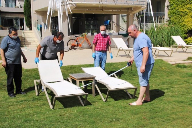 Restoranlarda uygulanan masa sandalye aralığı gibi deniz ve havuz kenarlarında bulunan şezlonglarda da sosyal mesafe ölçümleri yapılıyor. Sosyal mesafe aralığını metre ile ölçen otel yetilileri şezlong aralığını 2 metre olarak ölçüyor. Lobi girişinde resepsiyon görevlisi ile turist arasında yaklaşık 1,5 metrelik bir mesafe olacak. Otele girişte kullanılan imza kalemleri bile tek kişilik olacak şekilde Bodrum’da hazırlıklar yapılıyor. Bodrum’da bulunan birçok otelin şimdiden ateş ölçer, el dezenfektanları ve maske alımına başladığı öğrenildi. Bazı oteller ise kişiye özel el dezenfekte kutularını gelen turistlere vermeyi planlıyor.