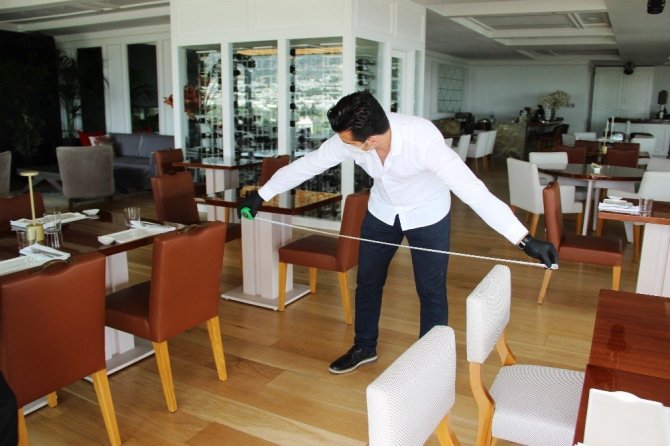 Ambrosia Oteli Genel Müdürü İsmail Düşmez şimdiden restoran ayarlamalarını yaptıklarını belirterek, “Sosyal mesafe aralığı 1,5 ama insanlar oturduğu zaman sandalyeye bu mesafe yaklaşacak ister istemez. Biz 2 metre olarak hesaplıyoruz. 2 masa arası 2 metre 80 santim olarak ayarlıyoruz. Biz de artık ufak ufak tedbirlerimizi almaya başladık. Sosyal mesafeler belli, sandalye ve masa aralıkları belli, bu yüzden şimdiden otel restoranından başladık hazırlıklara. Sayın Bakanımızın yaptığı hareket planına göre hareket edeceğiz. Sayın Bakanımız çok uğraşıyor turizmi canlandırmak için. Özellikle yurtdışı uçuşlarıyla ilgili büyük bir çaba sarf ediyor. Eğer bunu başarabilirse bizim için en büyük müjde bu olur. Sadece restoranlarda değil şezlonglar arasında da sosyal mesafe olacak. Şezlonglar arasında da 2 metre sosyal mesafe olacak. Resepsiyonda, yürüyüş yollarında bile sosyal mesafe olacak. Belirlenen her yere şeritler konulacak. Gelen misafirlerimiz otele girdiği andan itibaren sosyal mesafeyi koruyacak. Bu durum sadece gelen misafirlerimiz için geçerli değil kendi personellerimiz de bu mesafeyi koruyacak. Herkes kendi departmanından ayrılmayacak” dedi.