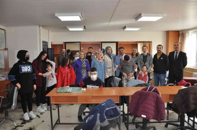 Özel eğitim alan öğrencilere yapılan saç kesimi ve bakımlarından sonra, ikramlar yapılarak, toplu halde hatıra fotoğrafı çekildi.