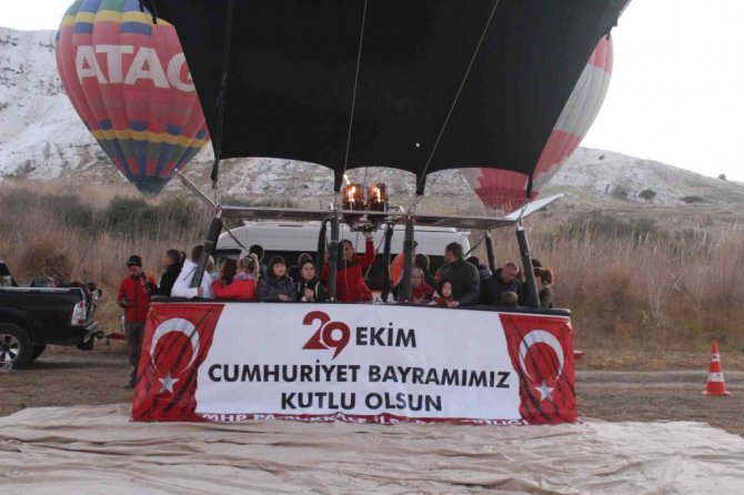 Denizli'de MHP Pamukkale İlçe Teşkilatı tarafından 29 Ekim Cumhuriyet Bayramının 98. yıldönümü farklı bir etkinlikte kutlandı. Üzerinde "29 Ekim Cumhuriyet Bayramımız Kutlu Olsun" yazılı dev afiş asılan balon, dünyaca ünlü Pamukkale travertenleri altındaki alandan havalandı. İçindeki yolcularla birlikte yerden yaklaşık 1000 metre yükselen balon, yaklaşık 1 saat havada kaldı. Balonu uçuran pilot, yolcularla birlikte travertenler altındaki Kocaçukur mevkiindeki havuzu iniş yapıp tekrar yükseldi.